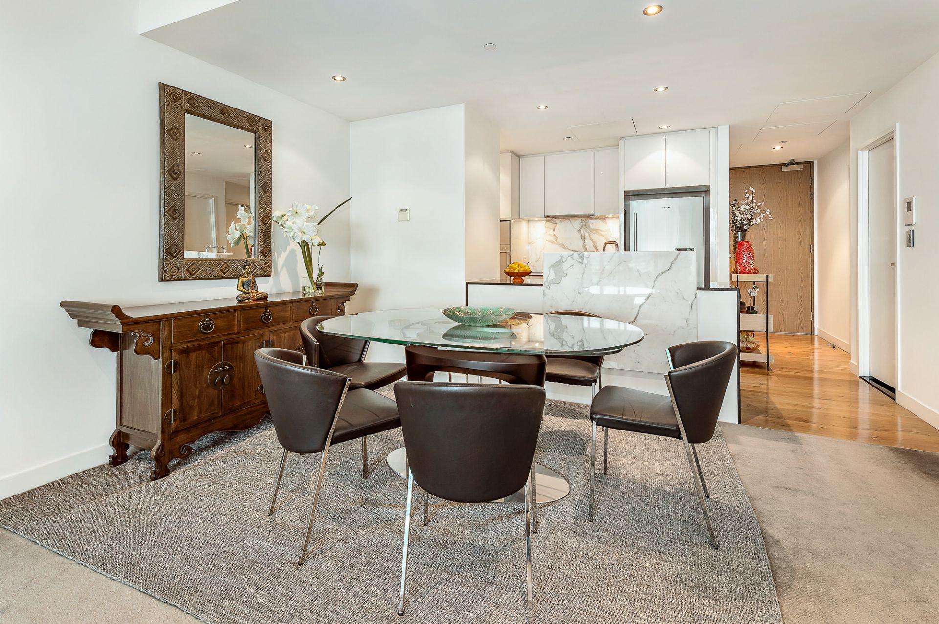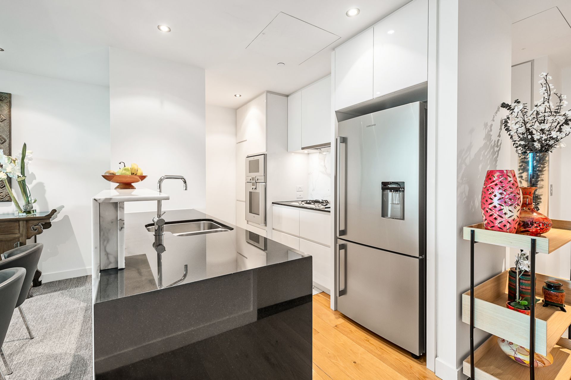 Come home to a luxury apartment featuring a light filled open plan living room and dining area with floor to ceiling glass sliding doors opening onto a large undercover balcony with a glass wall of motorised louvers to create the ultimate outdoor room while captivating the stunning views of Fawkner Park. A contemporary streamlined kitchen features quality Gaggenau stainless steel appliances, marble island bench and plenty of cabinetry. The master bedroom is complete with a walk-in n robe and opulent ensuite including a deep inset bath while the second bedroom with BIR's is also served with its own private bathroom. A study, powder room, European Laundry, security enty and ducted heating and cooling exudes luxury while 2 secure side-by-side car spaces completes the picture. Perfectly positioned close to Albert Park Lake, trendy eateries, transport, parks and schools.This is luxury living at its finest!