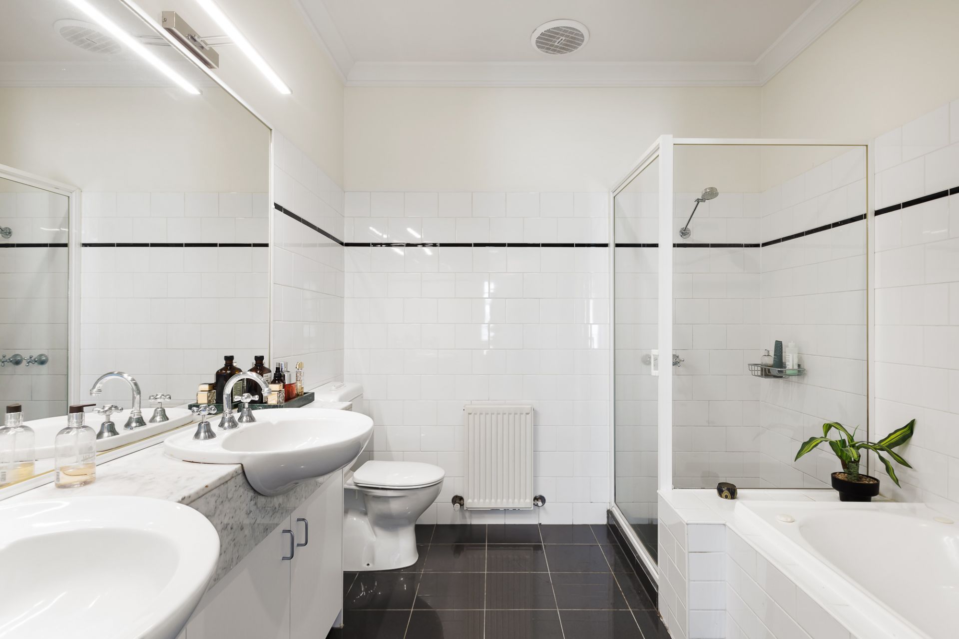 The master suite offers built-in robes, a private balcony and its own sleek ensuite, while two additional bedrooms are cleverly zoned on separate wings and serviced by an opulent central bathroom. Comfort is assured year-round with hydronic heating, A/C units, and the convenience of a European laundry.