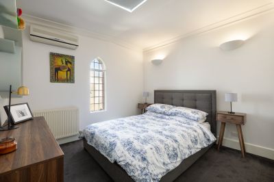 Beyond the striking heritage façade, you're greeted by dramatic soaring ceilings and magnificent arched leadlight windows that flood the interiors with character and light. Expansive living and dining spaces connect seamlessly to a state-of-the-art Miele kitchen, fully appointed with gas cooking, integrated coffee machine, microwave and dishwasher perfectly designed for contemporary entertaining.