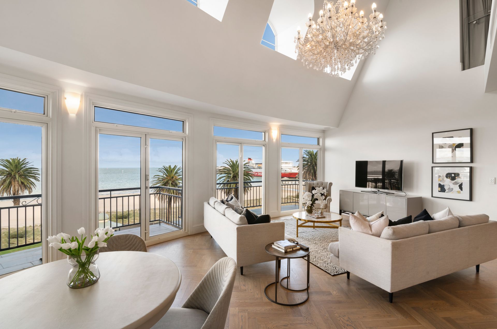 LEASED***LEASED Commanding breathtaking water views, this palatial penthouse, gracing the top two levels of Port Melbourne's iconic 'The Anchorage', is opulently appointed for luxurious living and entertaining. Evoking all the glamour of the French Riviera, inspired by the palm-lined waterfront it overlooks, the Parisian-inspired interiors include arched highlight windows in the double-height main living space, herringbone oak flooring and a pair of show-stopping crystal chandeliers. Perfectly positioned for glorious sunsets, two wide balconies open from the spacious main living zone. The mesmerising views begin with the sandy stretch of beach opposite, and sweep across the Bay and around to Station Pier. The sleek stone and blonde-timber veneer chef's kitchen and butler's pantry hosts an impressive range of integrated appliances including a suite of De Dietrich wall ovens, 900mm induction cooktop, hidden double-door fridge/freezer plus a Miele dishwasher and a wine fridge. The views are also excellent from the two lower-level bedrooms, one with marble ensuite and WIR, the other currently used as formal dining room however can be converted to a third bedroom. There is also a downstairs marble powder room. Upstairs, the show stopping mezzanine master suite reveals a world of light-filled luxury, space, and captivating water views. There is a study/ retreat area, a beautifully fitted dressing room with dual WIRs, a luxurious floor-to-ceiling marble bathroom with a stunning French-antique inspired washstand/vanity. Includes central heating and cooling, security intercom entry, two basement car parks and a storage cage. Residents of The Anchorage enjoy access to the communal gym, outdoor swimming pool, and lush landscaped grounds. Ideally located adjacent to Station Pier, it is within a few steps to the beach, the Bay Trail, Bay Street cafes and restaurants and the light rail to city.