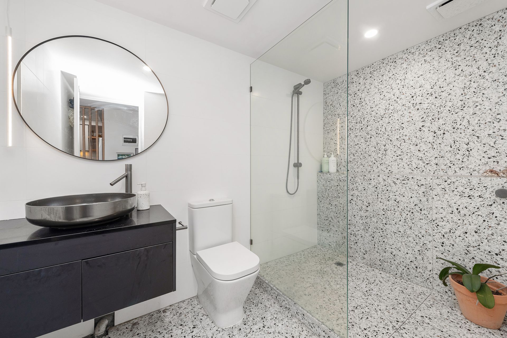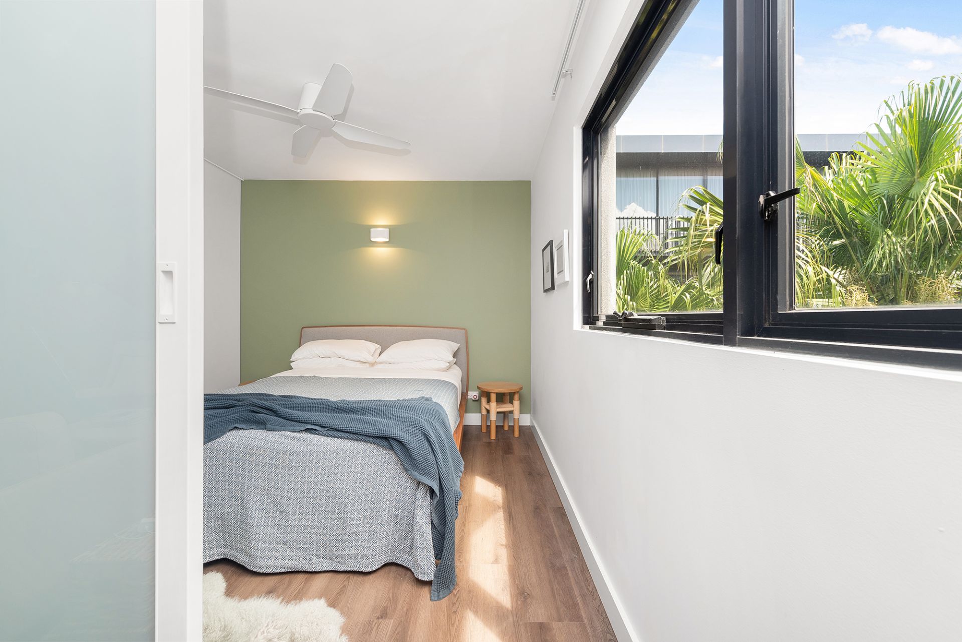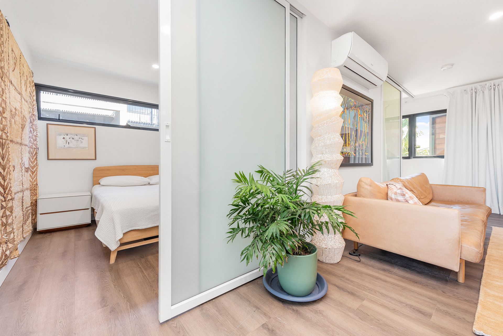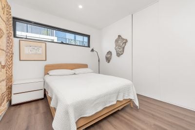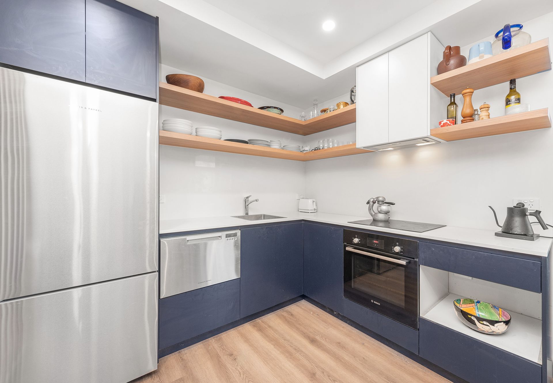 The sleek, modern kitchen is beautifully appointed with stainless-steel appliances, a dishwasher, and warm timber shelving, creating a stylish yet functional space. The sparkling central bathroom features a walk-in shower, servicing two bedrooms, both with built-in robes. The main bedroom offers a lush, leafy aspect, making every day feel like a holiday retreat.