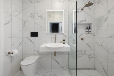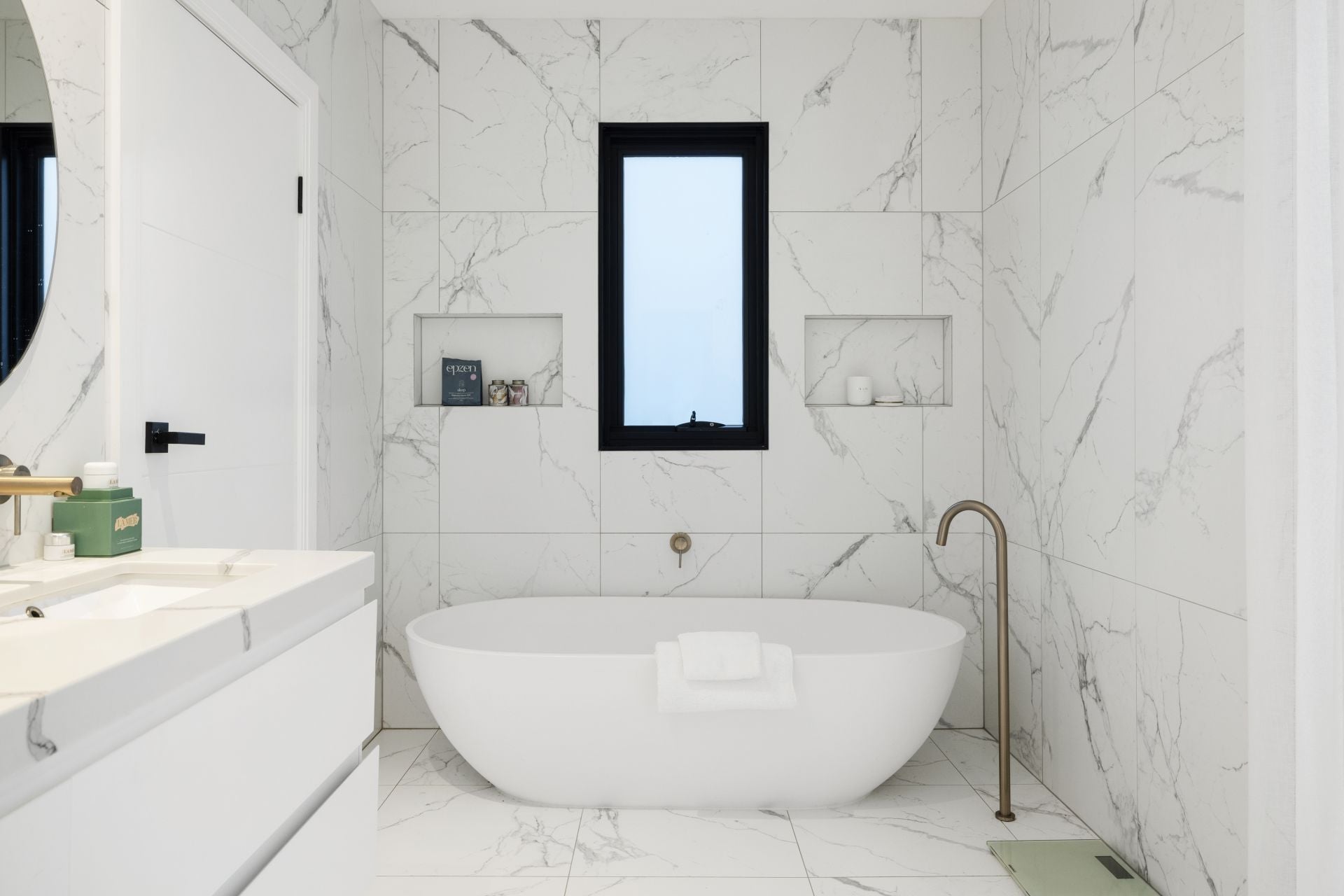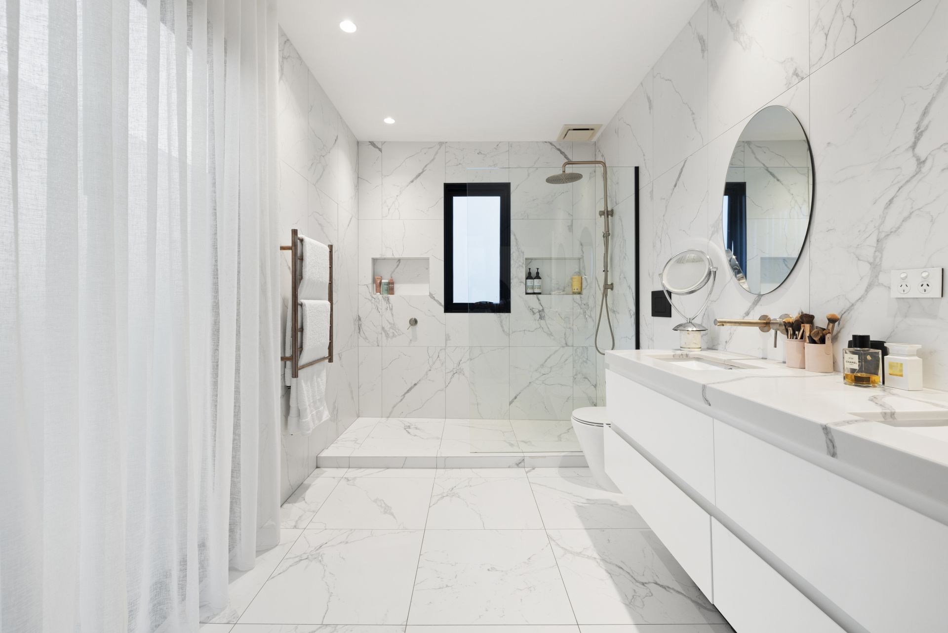 Exceptionally zoned, the interior welcomes adaptability, with a ground-floor bedroom paired with a luxe bathroom, two additional robed bedrooms upstairs and a family bathroom designed around a luxurious soaking bath. The exceptional main suite follows suit, unfolding to the rear of the home with a city-view terrace, a second balcony and a luxe ensuite detailed with dual vanities and freestanding bath.