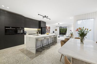 Downstairs, the living and dining domain is impressive, open, airy, and effortless, extending outdoors where greenery cascades over the alfresco dining deck and established plantings create a private oasis. The kitchen is equally striking, draped in sleek stone and equipped with twin ovens, a 900mm gas cooktop, and an integrated dishwasher, linking with an office/sitting room.