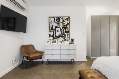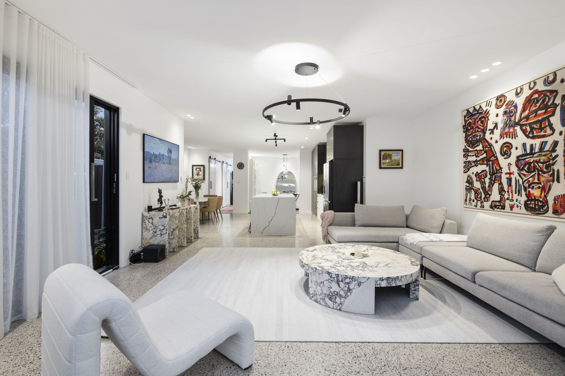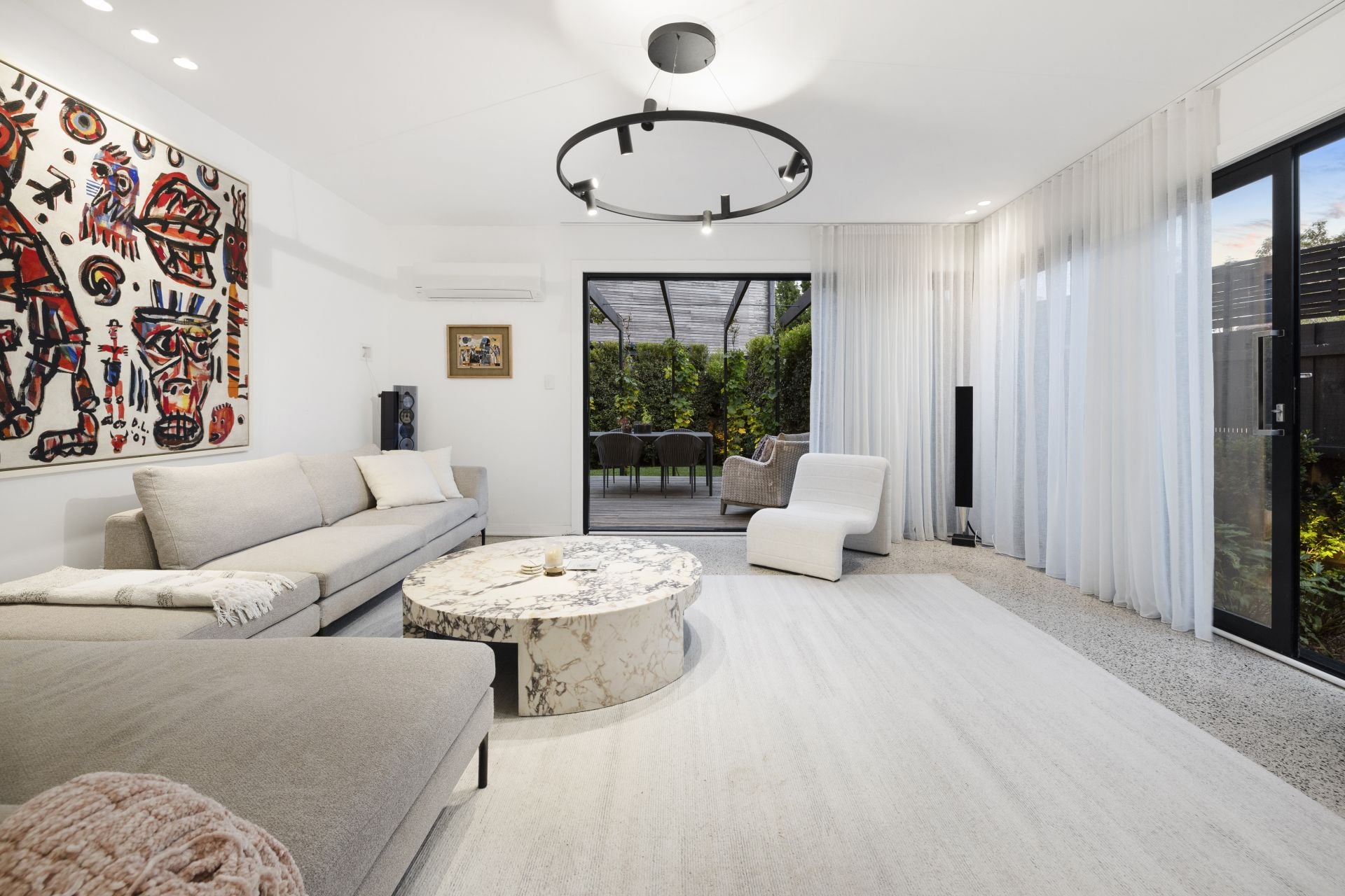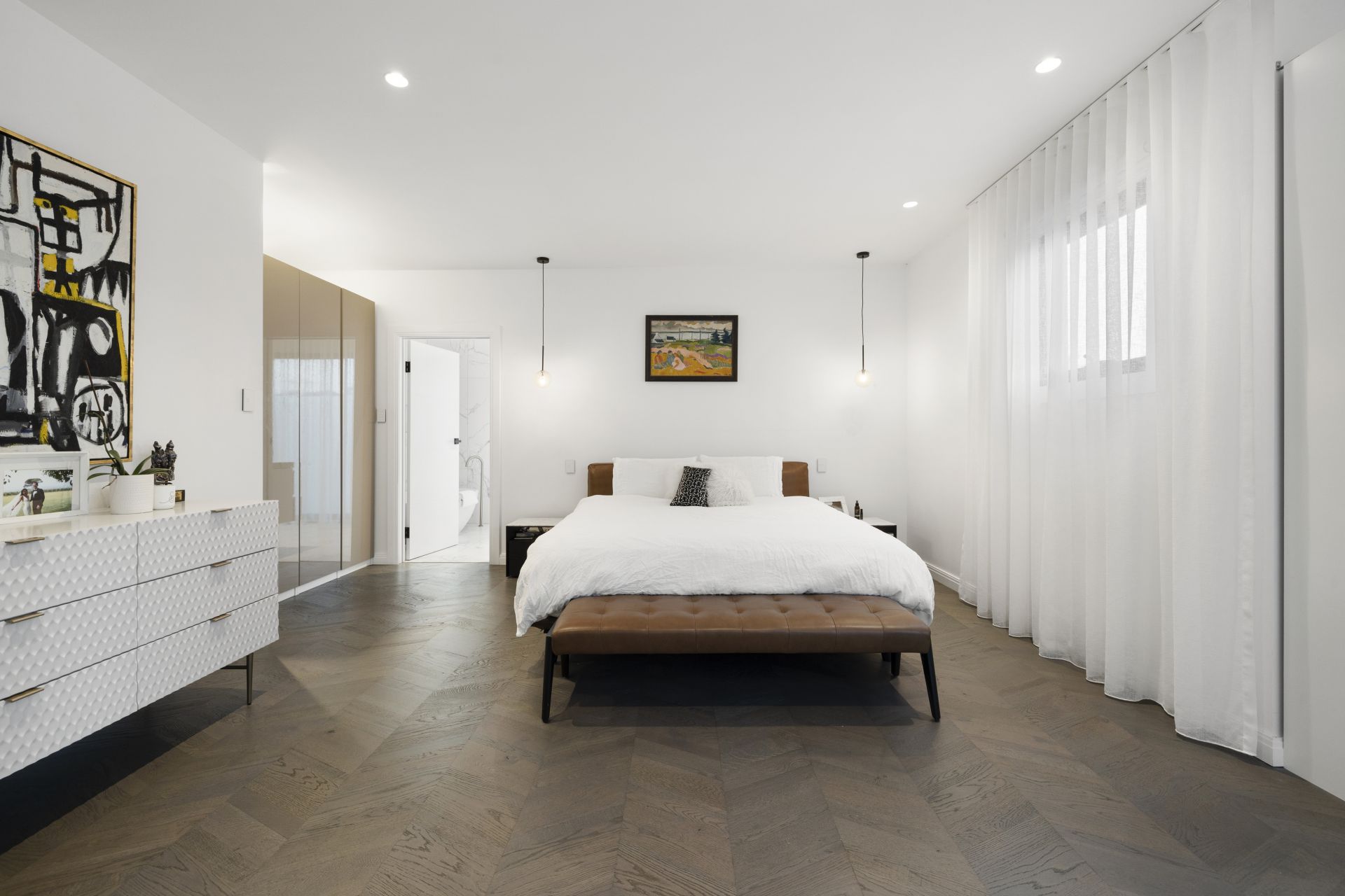Interiors have been meticulously revived and refined with chevron oak and polished concrete floors, dramatic ceiling heights, and luscious sheers filtering natural light across the double-storey floor plan.