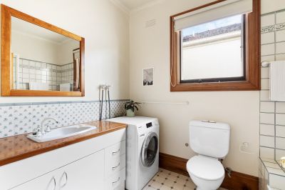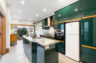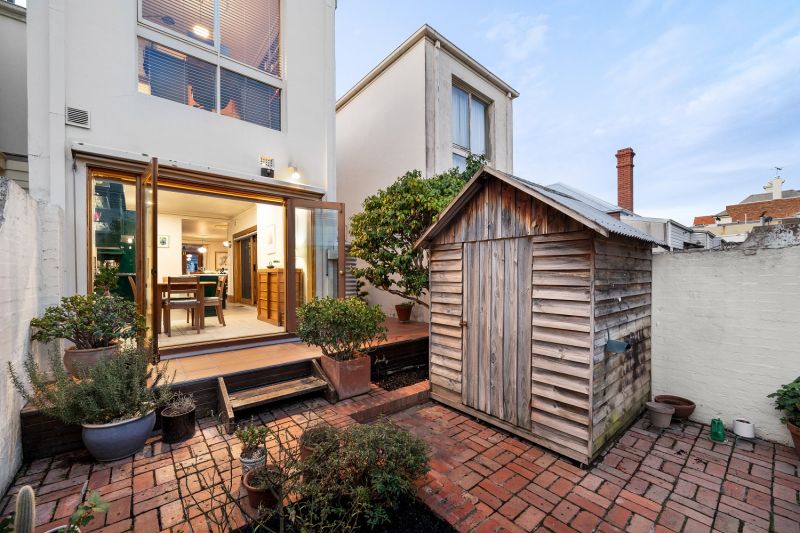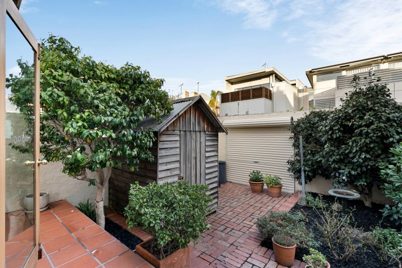 Picture Perfect, its stained glass details, iron lace balcony and leafy surrounds lead into an expansive, light-filled layout, with generous living and dining zones warmed by a gas log fire. French doors on either side draw in lovely garden outlooks and natural light, leading to the rear kitchen with stainless steel detailing, Miele appliances and an integrated dishwasher. Timber-framed glass sliders open fully to a wraparound paved courtyard, a sun-drenched and private setting elevated by low-maintenance garden beds, with a shed and gated access for bringing in a car off the street.