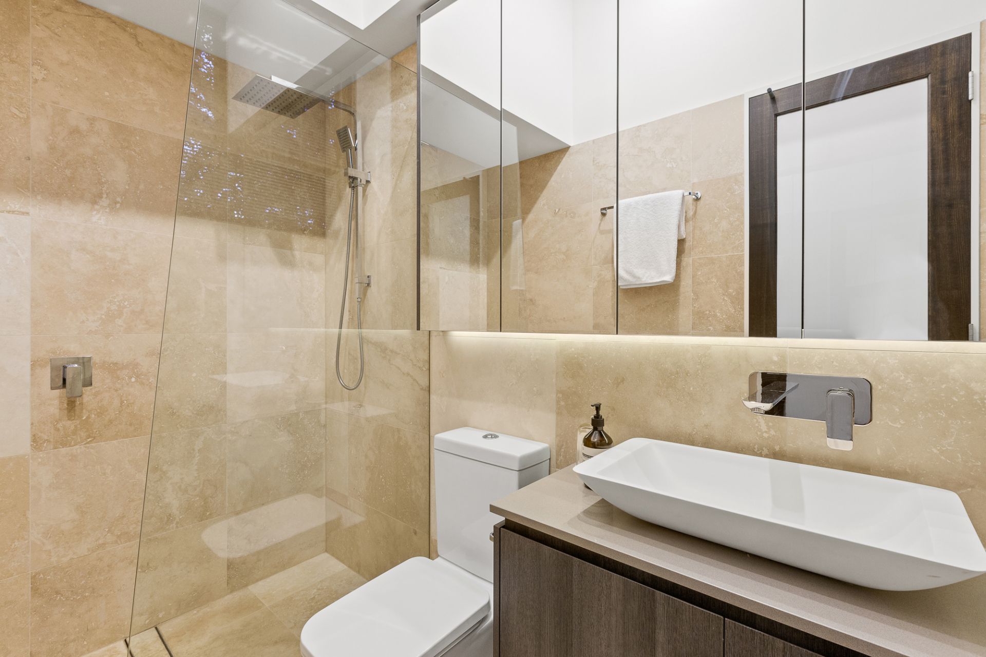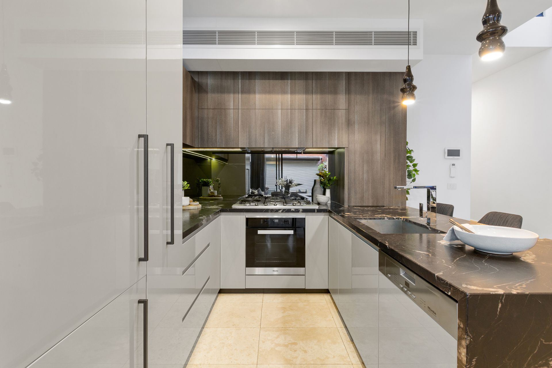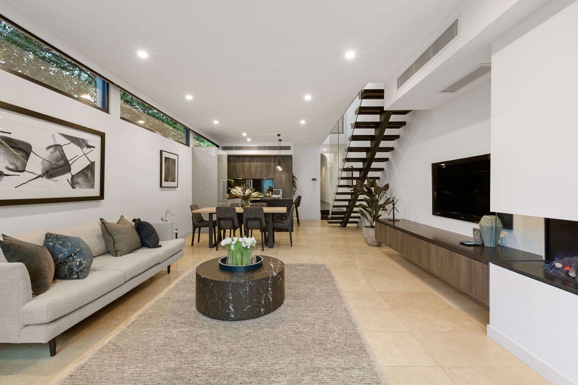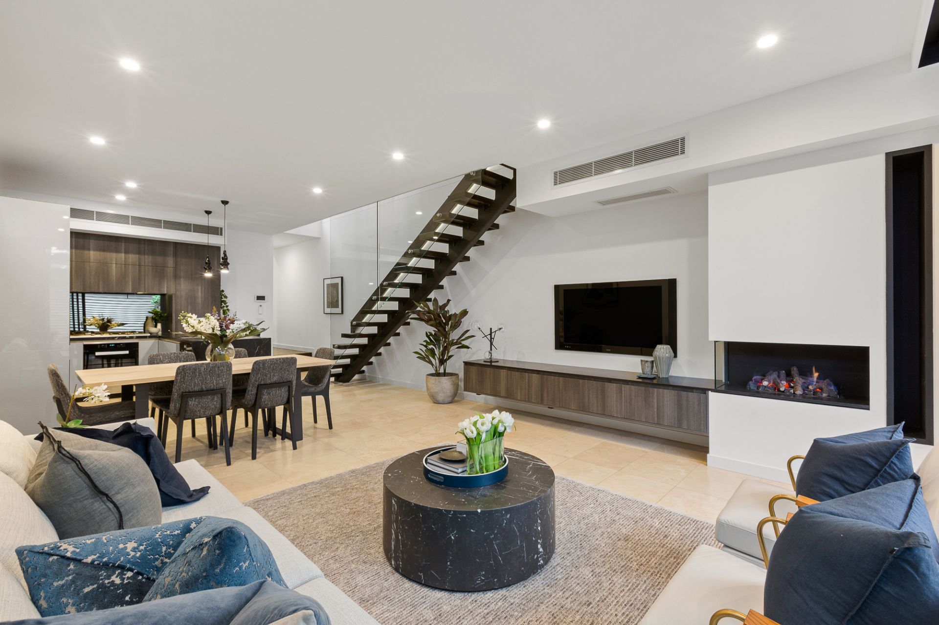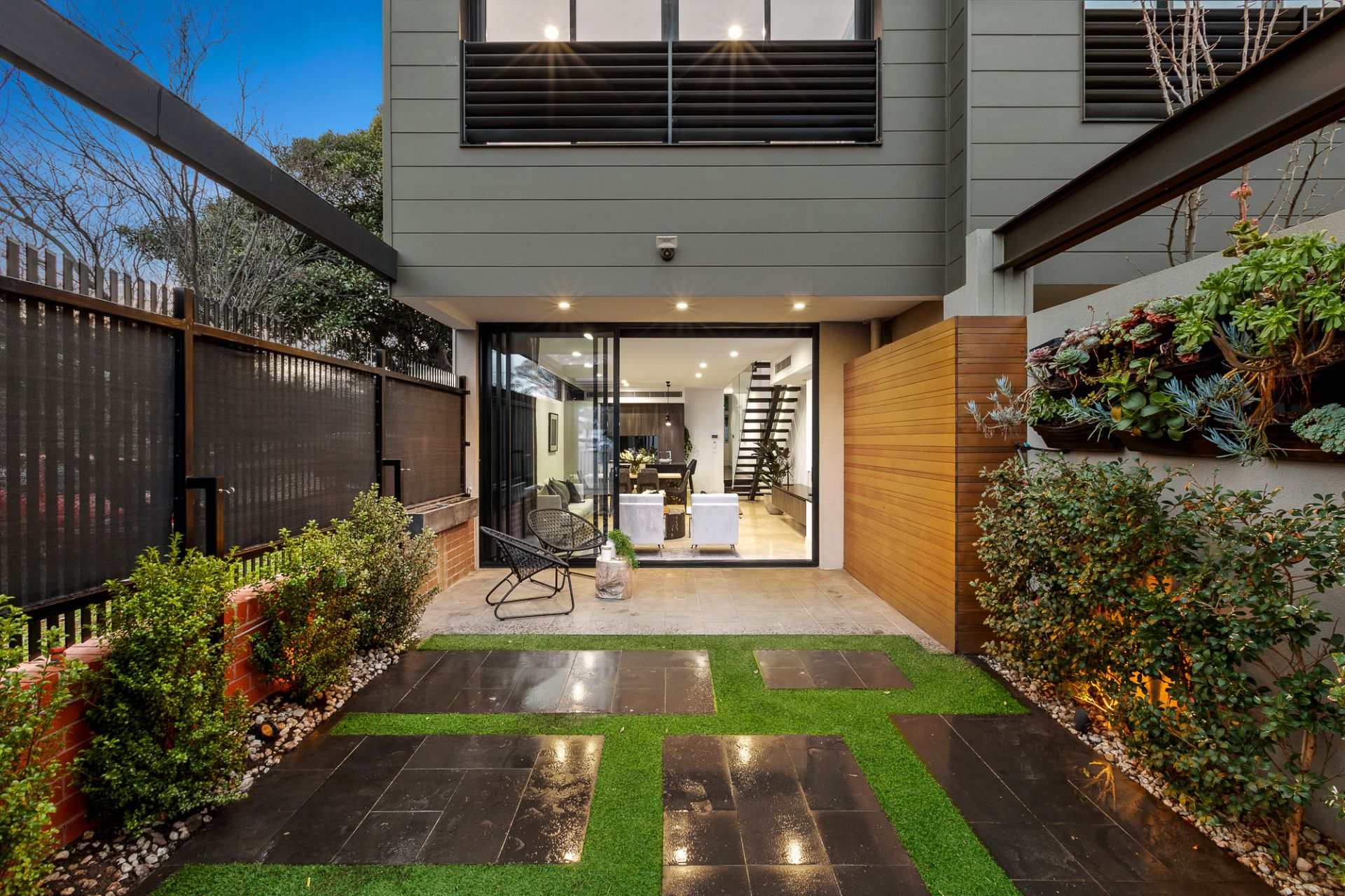 Well designed for a family, all three bedrooms come complete with private en suites including the separately zoned master bedroom with feature fireplace, ceiling rose and walk through robe. Two further bedrooms one with a balcony and both containing built-in robes. Plantation shutters, a ground floor powder room, ducted heating and cooling, split system air conditioning in bedrooms, video intercom and ROW access are other highlights of this well appointed property.