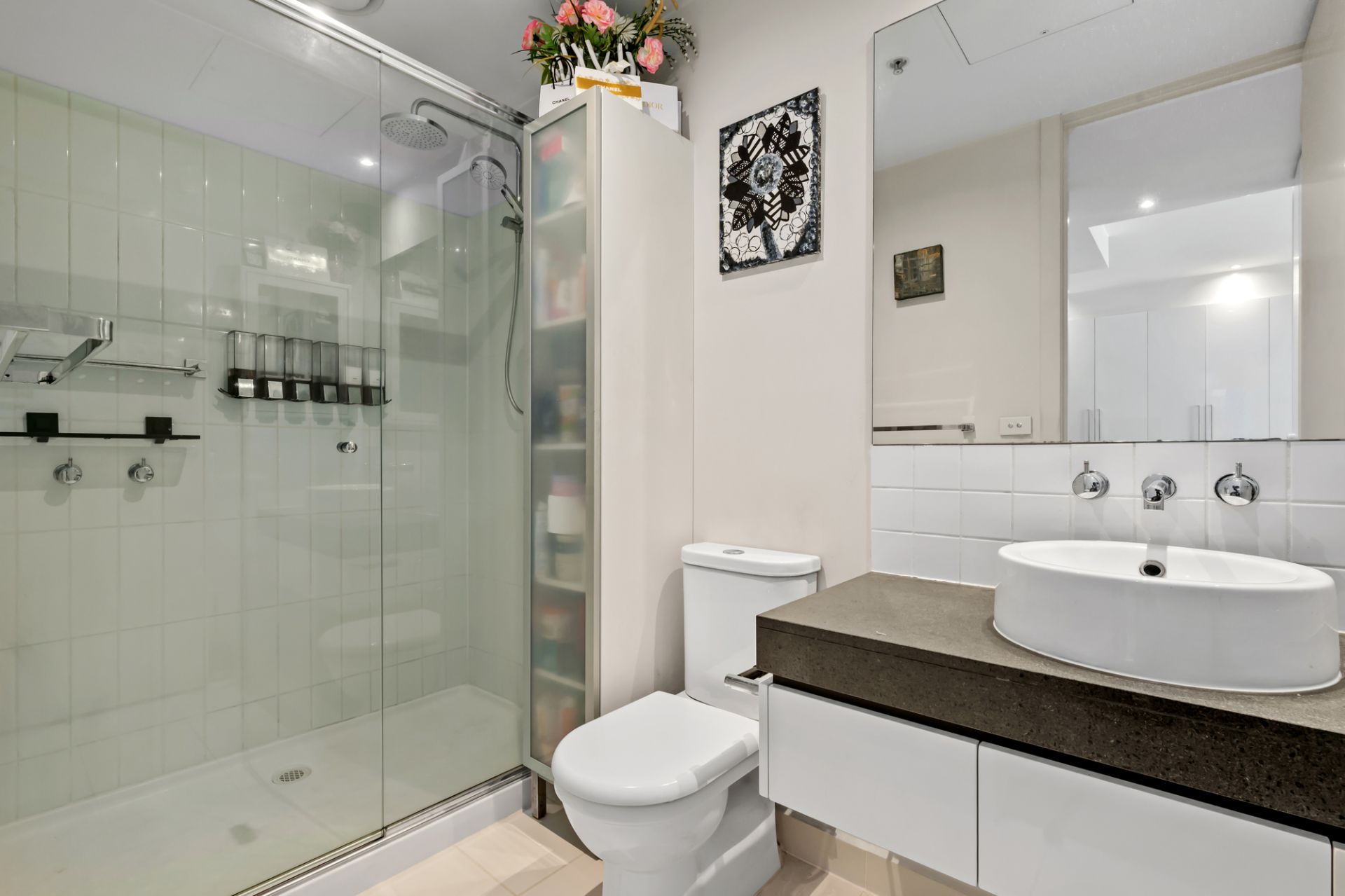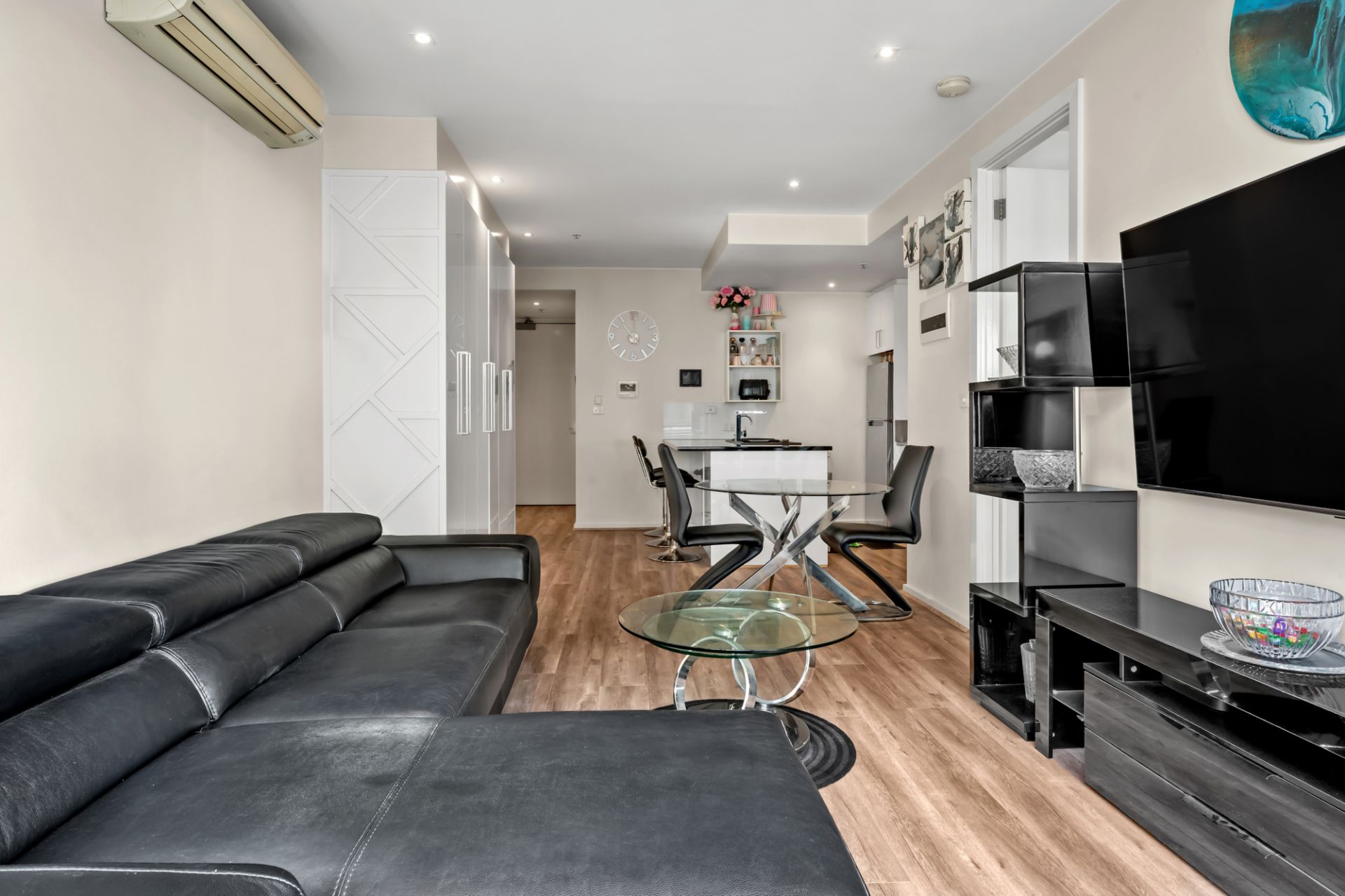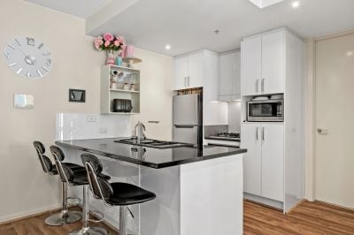 The open-plan living and dining area is bathed in sunlight, with floor-to-ceiling windows opening to a north-facing balcony. The stylish updated kitchen features sleek cabinetry and quality stainless steel appliances. Warm timber flooring flows throughout, enhancing the home's sophisticated feel.
