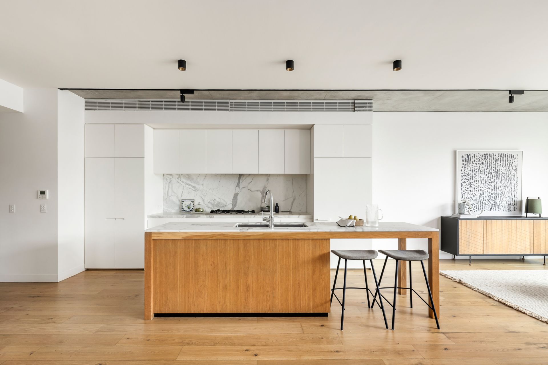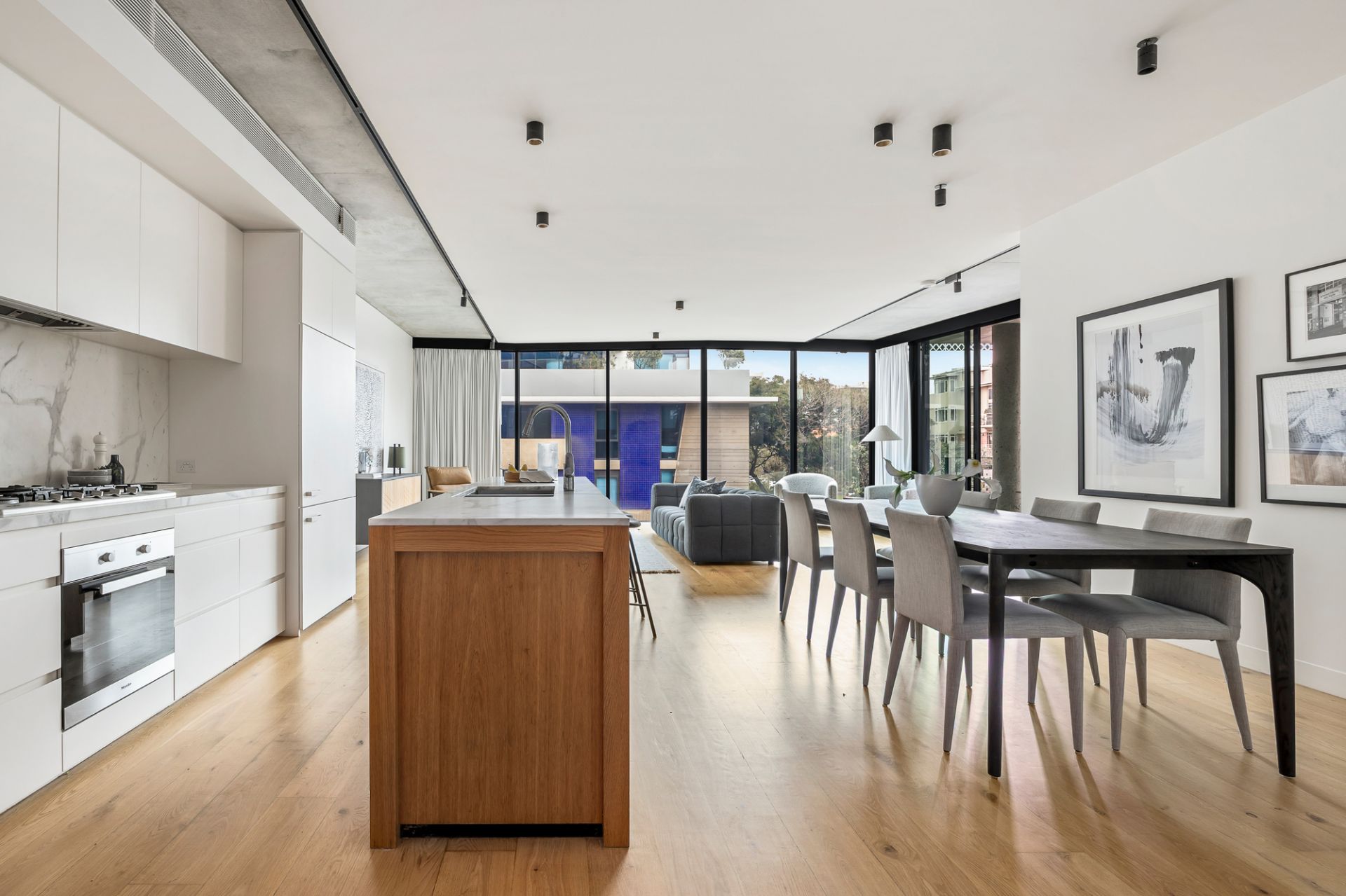 Designed by internationally acclaimed architect Wood Marsh, this expansive sanctuary is bathed in natural light, featuring a seamless flow between indoor and outdoor living. The striking marble kitchen, complete with an integrated fridge and premium finishes, effortlessly extends into vast living and dining spaces, culminating in a north-facing, undercover terrace-an idyllic setting for alfresco entertaining.