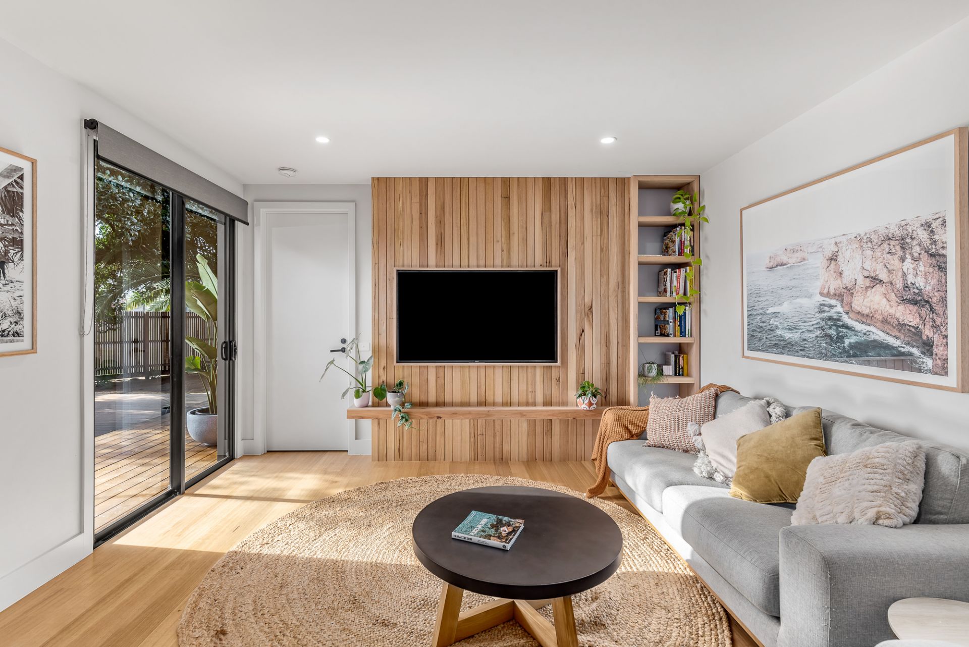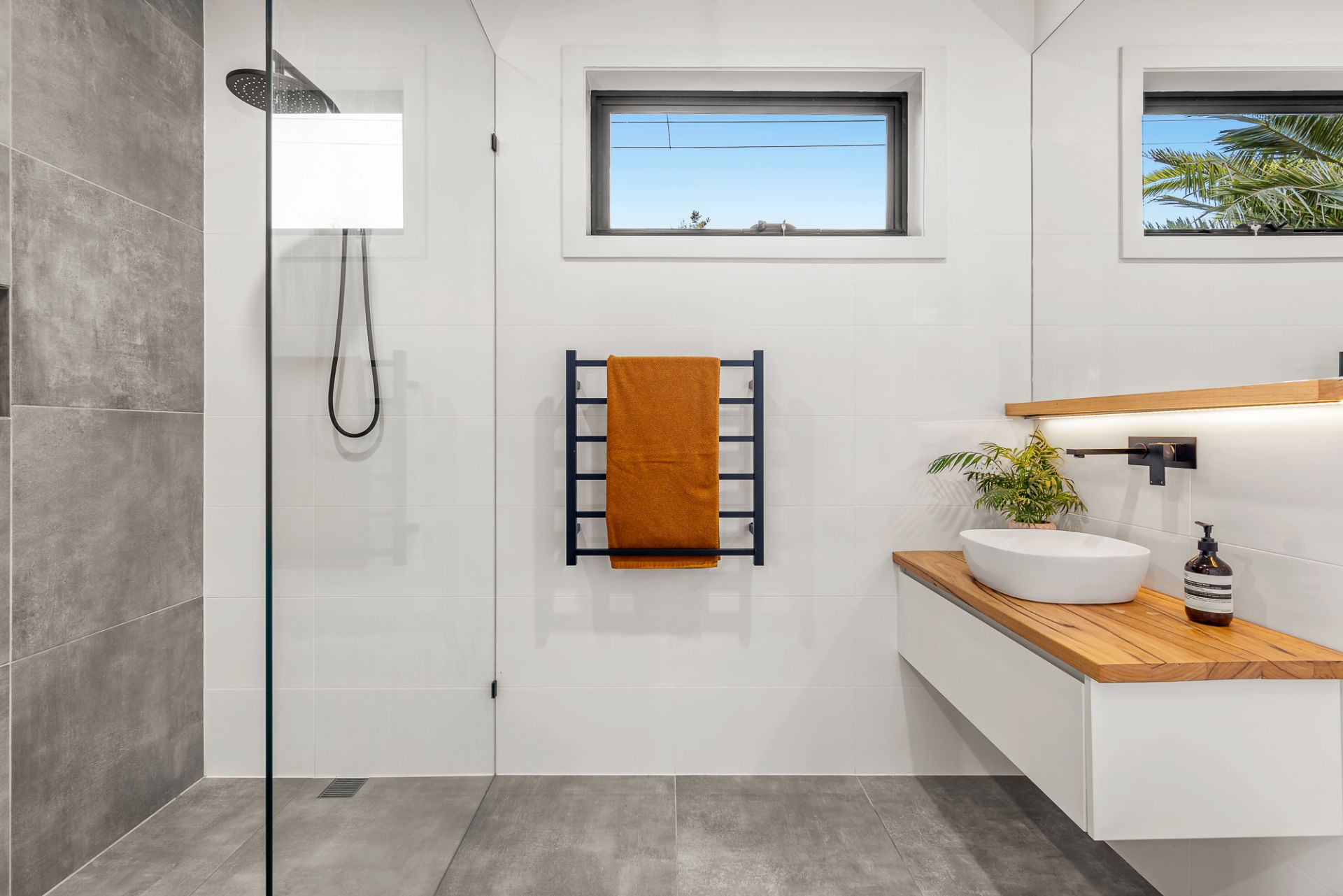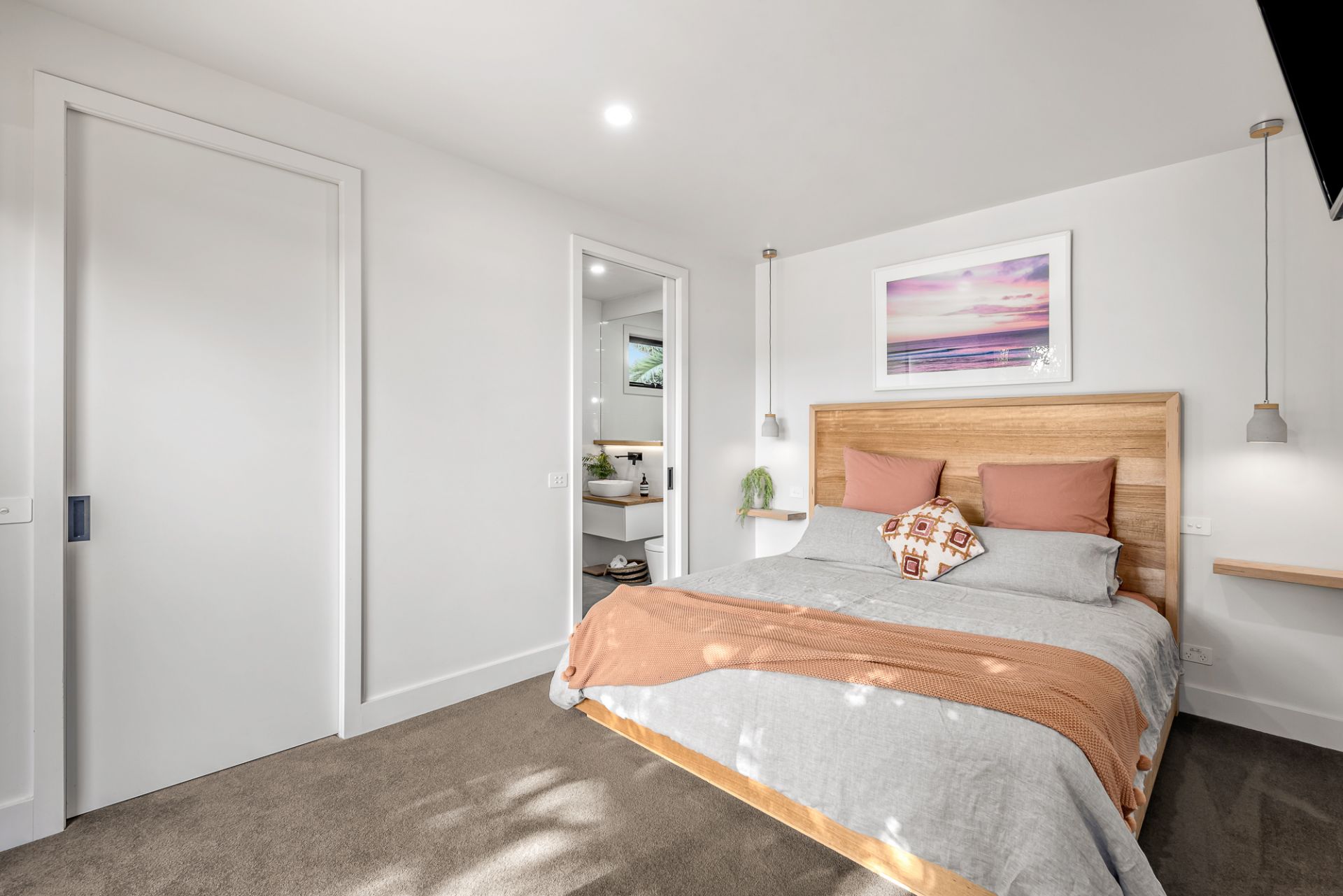 Interiors are light and airy with high ceilings and cool neutral tones generously warmed with Silvertop ash feature walls. Tasmanian oak flooring flows throughout the main living zones with central designer kitchen featuring stunning 'rugged concrete' Caeserstone benchtops and fitted with S/S Euro appliances including a double 600mm Smeg ovens beneath a 900mm Asko gas cooktop. Designer Abii tapware and lighting including LED strip lighting feature in the kitchen and bathrooms. The bedrooms all with BIRs are carpeted, the master bedroom has a WIR and designer ensuite. The luxurious main bathroom also features a free-standing designer tub, heated towel rail, floating timber vanity and raised basin.