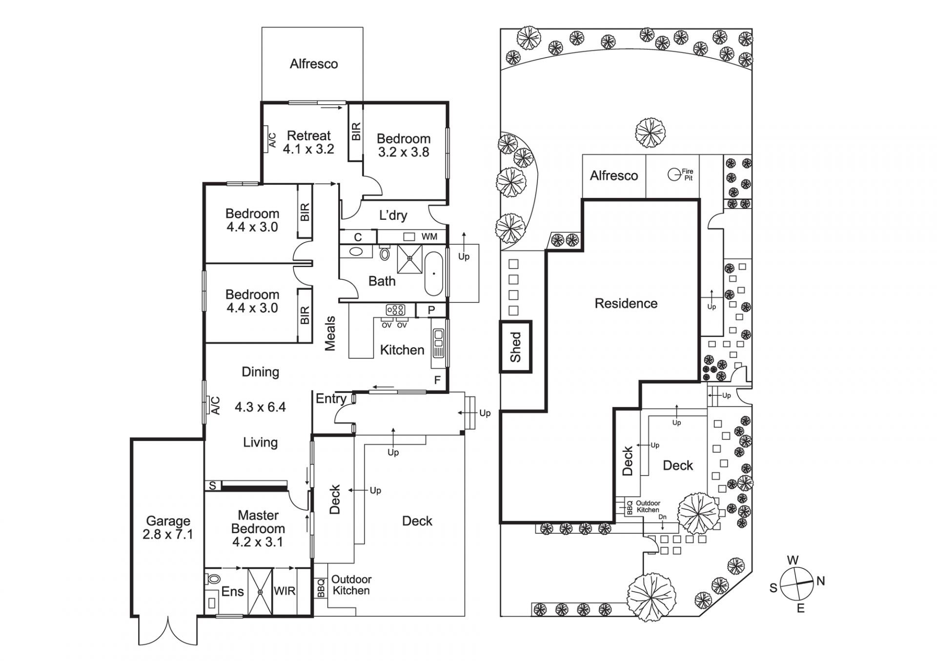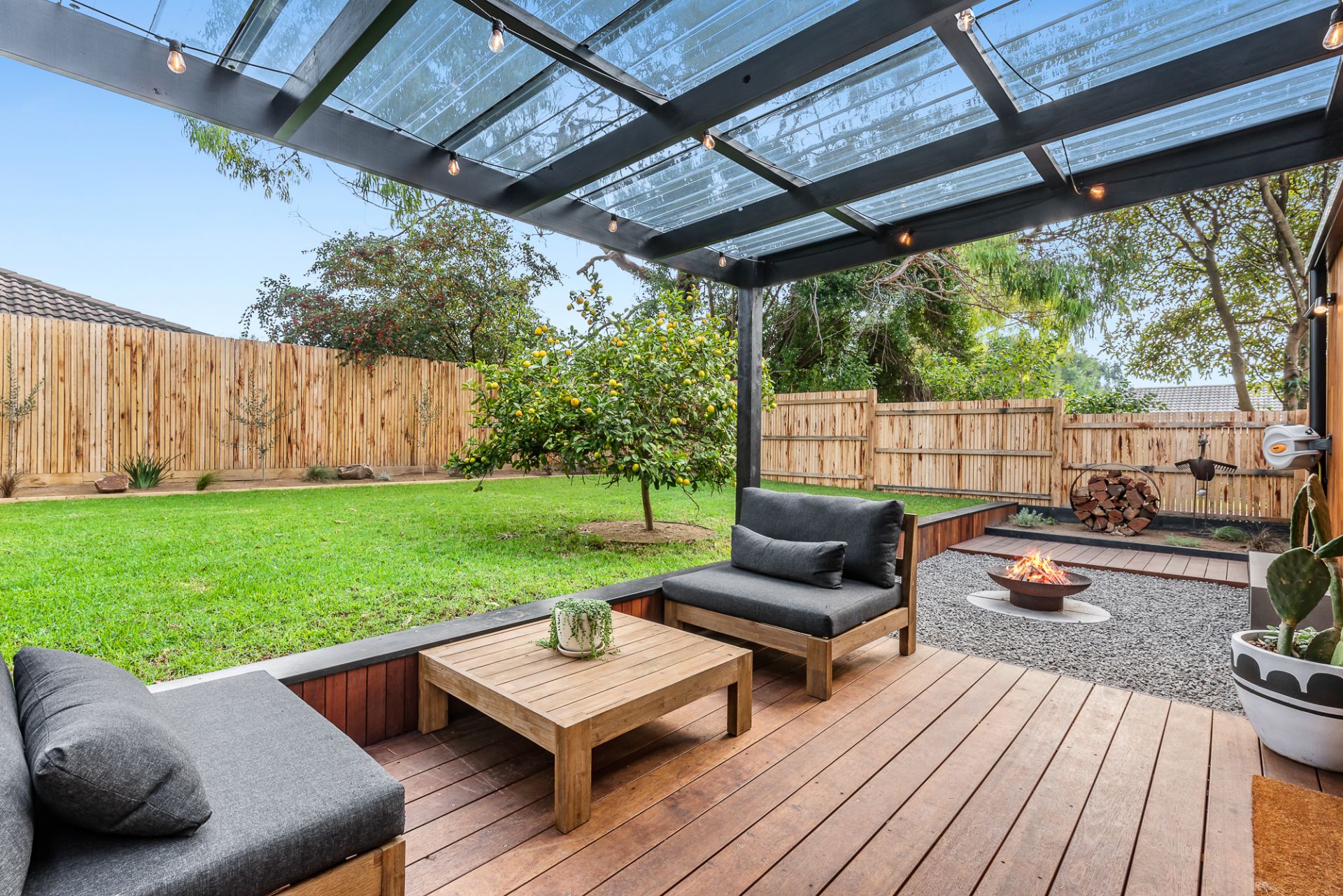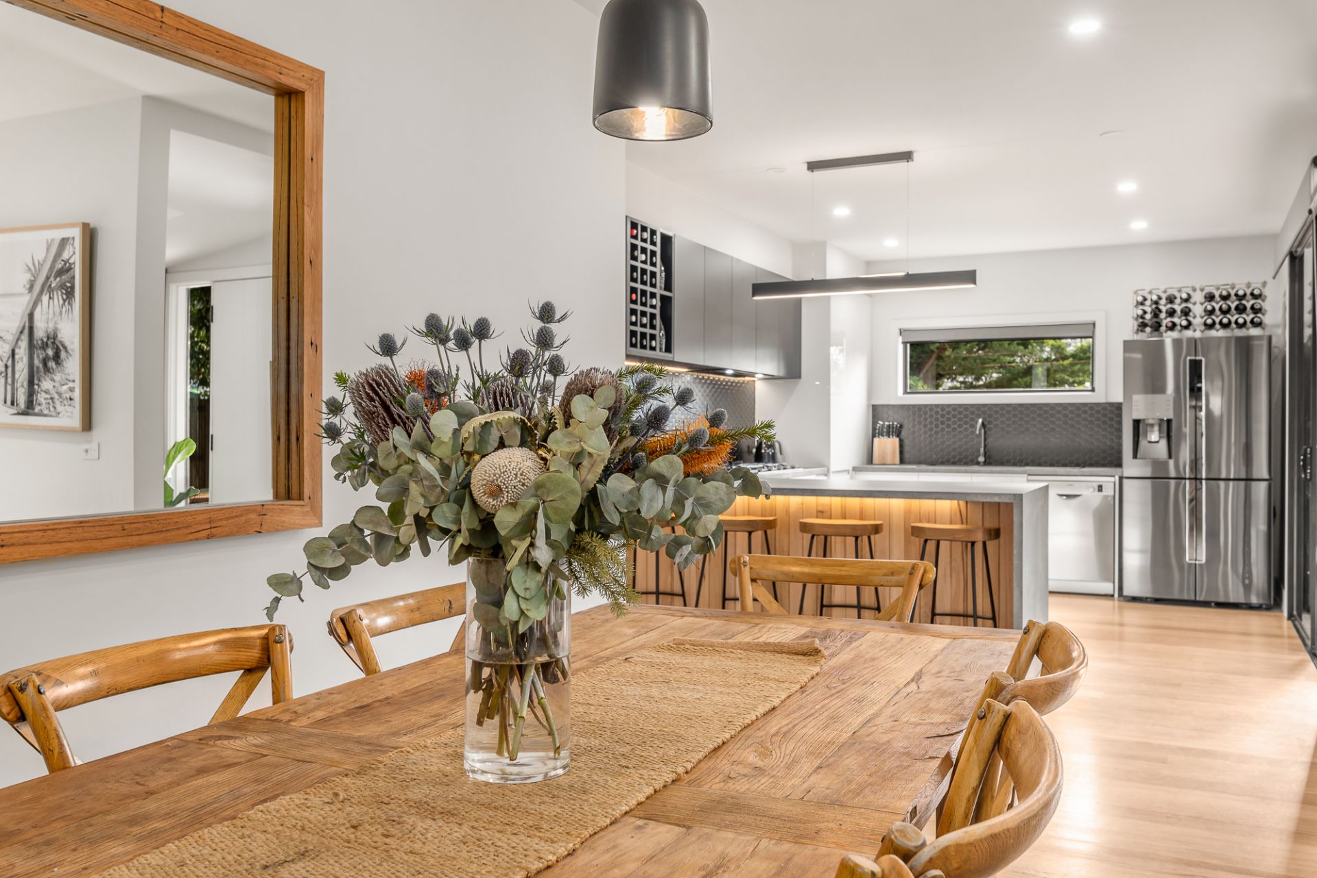 The outdoor entertaining zones include a covered alfresco dining deck plus sunken fire pit area and there is an inbuilt BBQ/outdoor kitchen. The decking is built around existing mature trees including a feature palm.