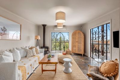 The central living zone opens seamlessly to a large outdoor terrace, ideal for BBQs or sun drenched brunches amid leafy outlooks across native Moonah trees and Mediterranean inspired gardens. Adjoining the kitchen is a charming dining nook with a window seat, while an ornate timber staircase leads to the top floor bedroom, complete with sea views and a private rooftop deck.